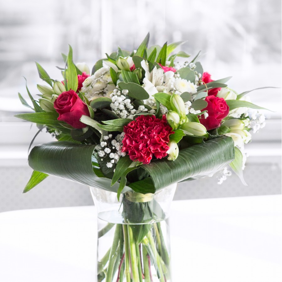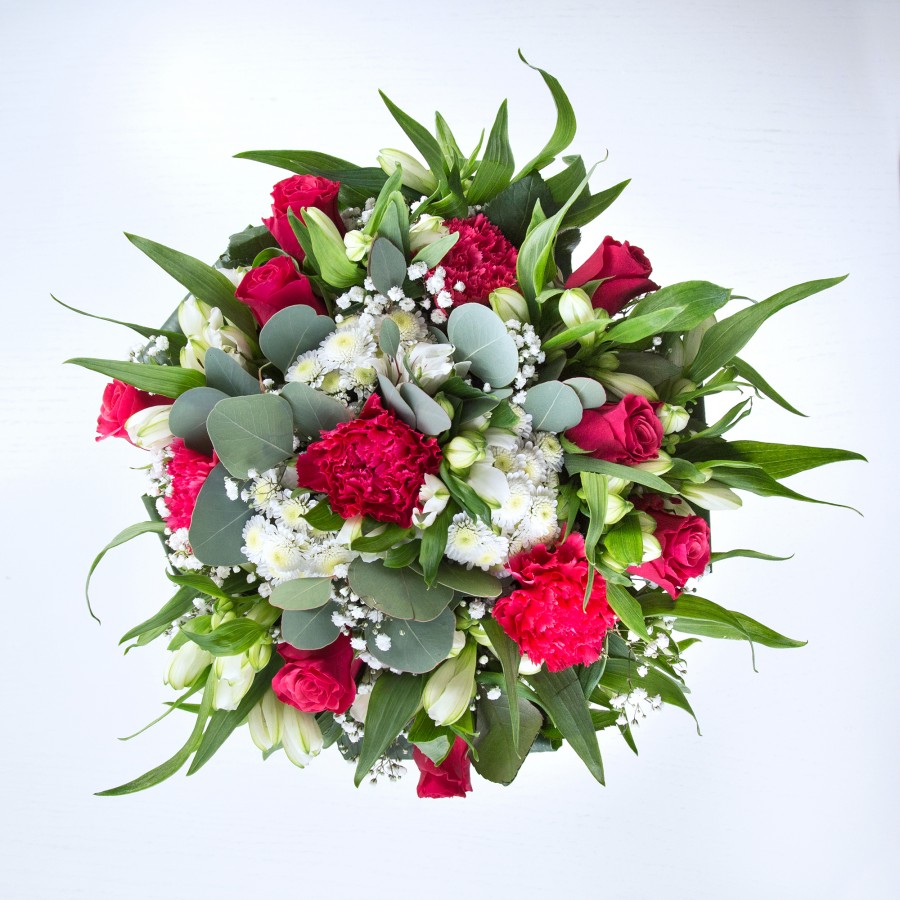 Step into a realm of beauty with our Enchanted Floral Express bouquet. This captivating arrangement blends passionate red roses, gentle carnations, and brilliant white chrysanthemums with airy gypsophila, delicate white alstroemeria, and rich aspidistra leaves. Each flower is specially hand-picked for maximum freshness, ensuring your gift exudes luxury and natural charm.