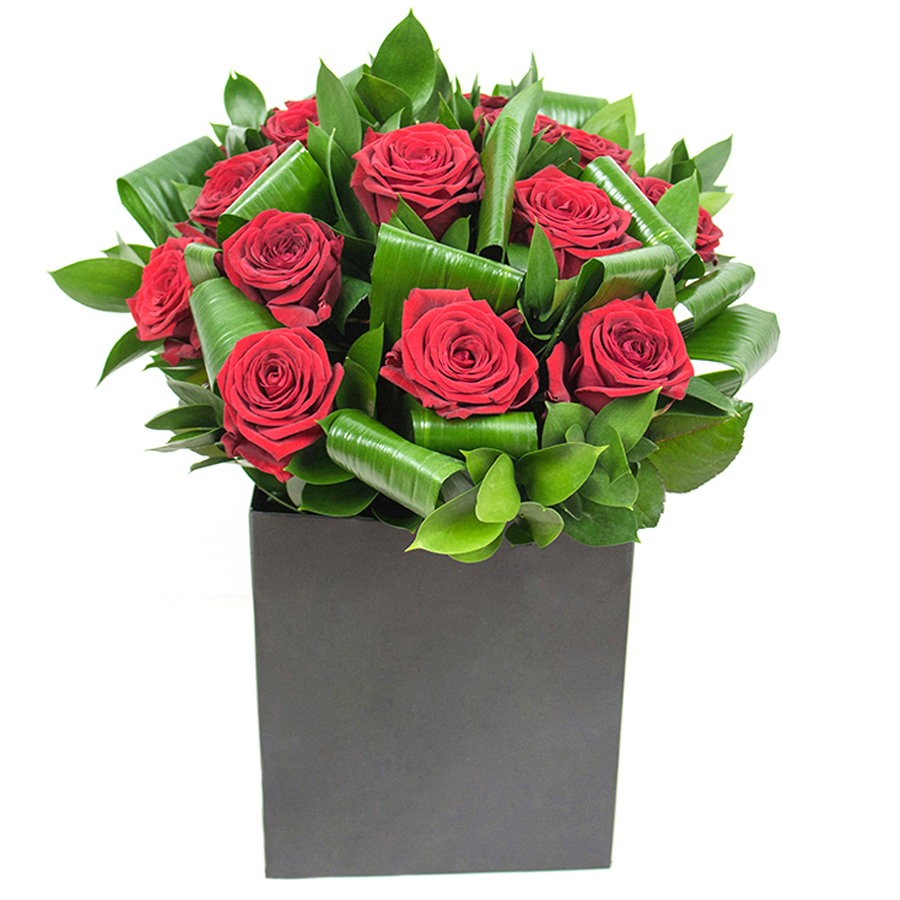 Enhance your space with our sophisticated bouquet, featuring vibrant red roses, lush aspidistra leaves, and delicate ruscus. This unique combination highlights the beauty and elegance of each flower, creating a stunning display.