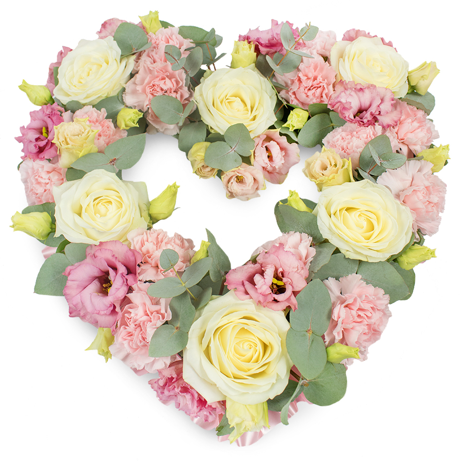 Show your heartfelt appreciation with our beautiful open heart tribute bouquet. This graceful arrangement features pristine white roses, soft pink carnations, and lovely pink lisianthus, complemented by fresh eucalyptus leaves. Each flower is carefully hand-selected to ensure top-tier freshness and quality.